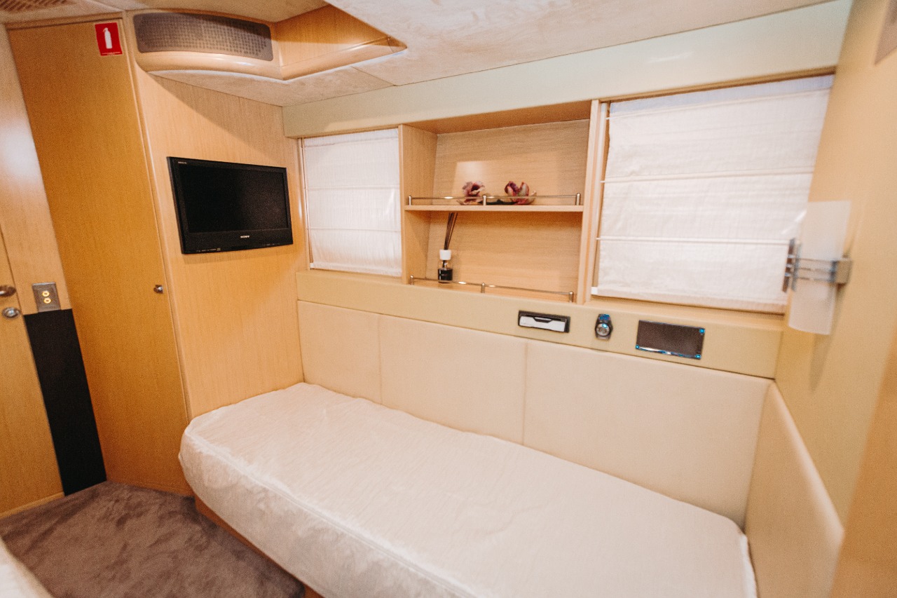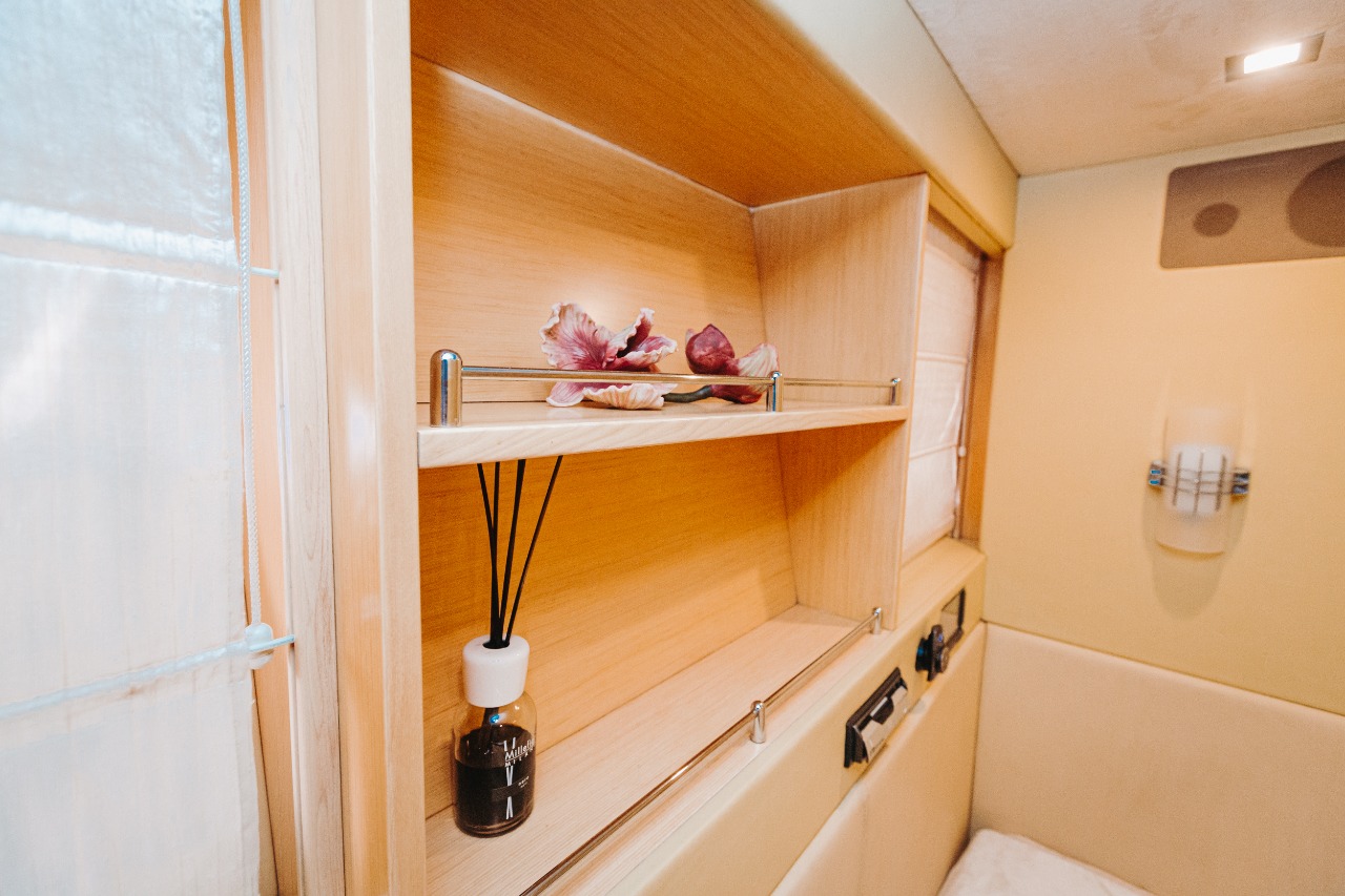 Для отдыха яхта предлагает три дизайнерских номера с исключительной красоты отделкой интерьеров и высочайшего качества оборудованием: многофункциональный мультимедийный центр на основе smart-телевизора Samsung Frame и ресивера Denon, который включает в себя систему «домашнего кинотеатра» для просмотра фильмов/трансляций/ концертов и т.п. с любого современного источника (в высоком качестве картинки и трехмерным звуком. Прослушивание музыки возможно в Lossless-формате. Система позволяет разграничить аудио зоны для комфортного прослушивания музыки в зоне Flight Bridge и просмотра фильма/прослушивания музыки/исполнения песен в Master-каюте и на корме.