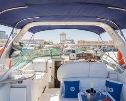 На борту яхты по всему периметру расположены мягкие диваны. Есть вместительный стол. От прямых солнечных лучей защищает тент. Платформа для купания довольно широкая. Комфортные места для загара находятся в носовой части судна.